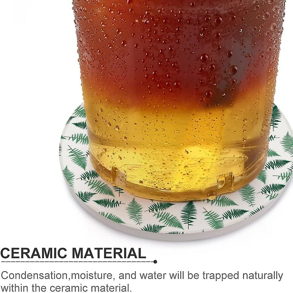 4Pcs Round Fern Leaf Pattern Ceramic Coasters with Cork-Backed for Coffee Drink Cup Mat Absorbent Stone CoastersMATERIAL: Made of absorbent ceramic stone, lined with non-slip cork backing to protect furniture topsPackage Includes: 4 pieces cup coasters set. The size of coaster is 10 cm (3.9 IN), thickness is 0.5cm (0.2), it suits for most of cup size, such as coffee cup, milk bottle or goblet and so onFUNCTION: Protect your table surfaces and add a new angle to your dayEASY CLEAN AND CARE: cup coasters can easily wash in the water and brush to clean. Dry it in the wind or sunshine and then reuse them without worrying about them fadingNICE GIFTS: They are the best choice for table decorations and festival parties. This table mats are also suitable for Restaurant, bar, kitchen, coffee table, TV cabinet, hotel. Nice housewarming, birthdays Gifts for family members or friends- Brand: Unbranded